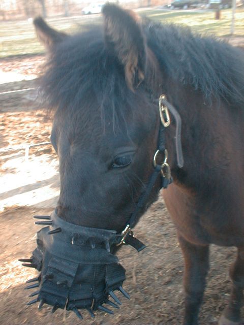 Here's Isaac at about six months in his weaning halter. He did not like it. He did get good at flipping the plastic spikes up. We finally gave up and separated him from mom for six months. That worked, and didn't involve too much anguish.